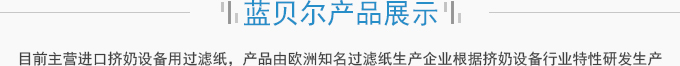 濟南藍(lán)貝爾工貿(mào)有限公司主要產(chǎn)品擠奶設(shè)備過濾紙,牛奶過濾紙,擠奶機過濾袋,目前主營進(jìn)口擠奶設(shè)備用過濾紙,產(chǎn)品由歐洲知名過濾紙生產(chǎn)企業(yè)根據(jù)擠奶設(shè)備行業(yè)特性研發(fā)生產(chǎn),產(chǎn)品符合歐盟食品接觸標(biāo)準(zhǔn)及FDA食品接觸標(biāo)準(zhǔn),產(chǎn)品在擠奶設(shè)備過濾紙行業(yè)占有70%以上的份額。并通過了SGS標(biāo)準(zhǔn)技術(shù)檢測中心按國標(biāo)食品級標(biāo)準(zhǔn)進(jìn)行的檢測。產(chǎn)品適用于各種擠奶設(shè)備品牌,本公司目前獲得該區(qū)域產(chǎn)品營銷資格。產(chǎn)品已用于國內(nèi)各大乳企所屬牧...